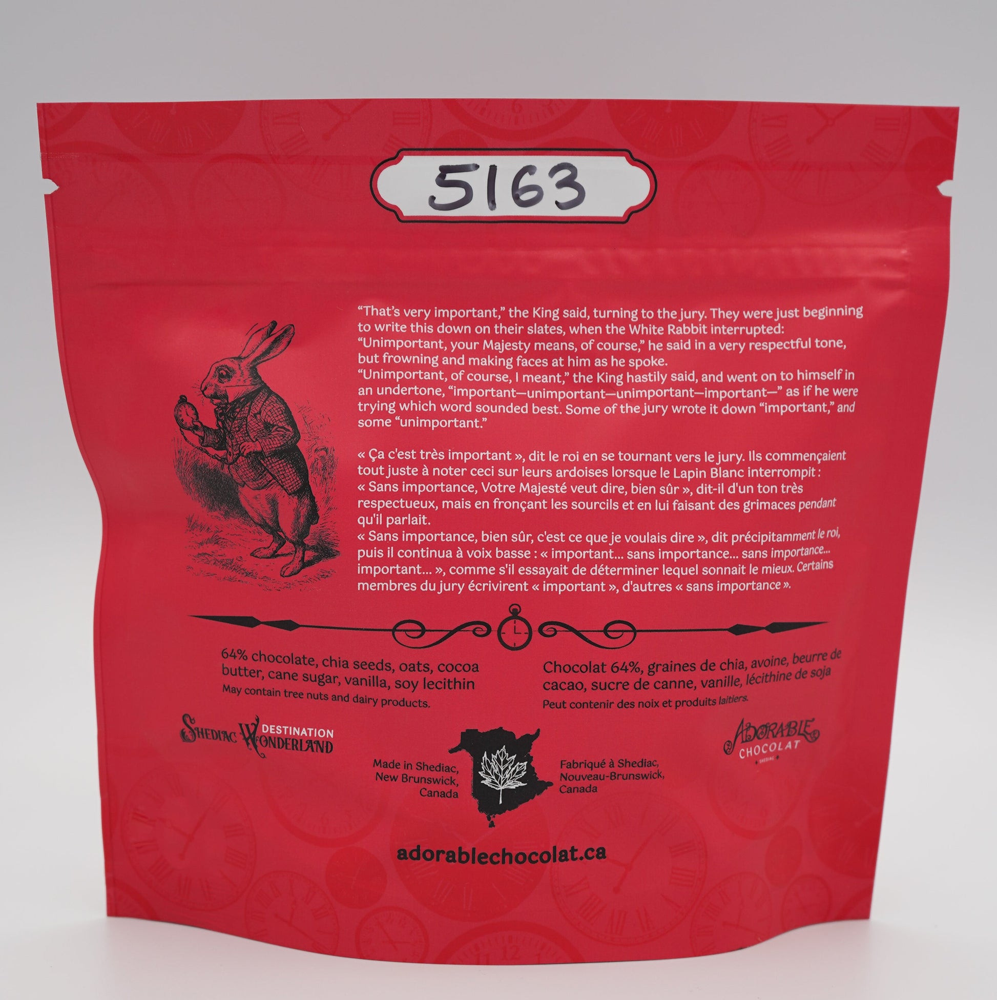 64% chocolate, chia seeds, oats, cocoa butter, cane sugar, vanilla, soy lecithin